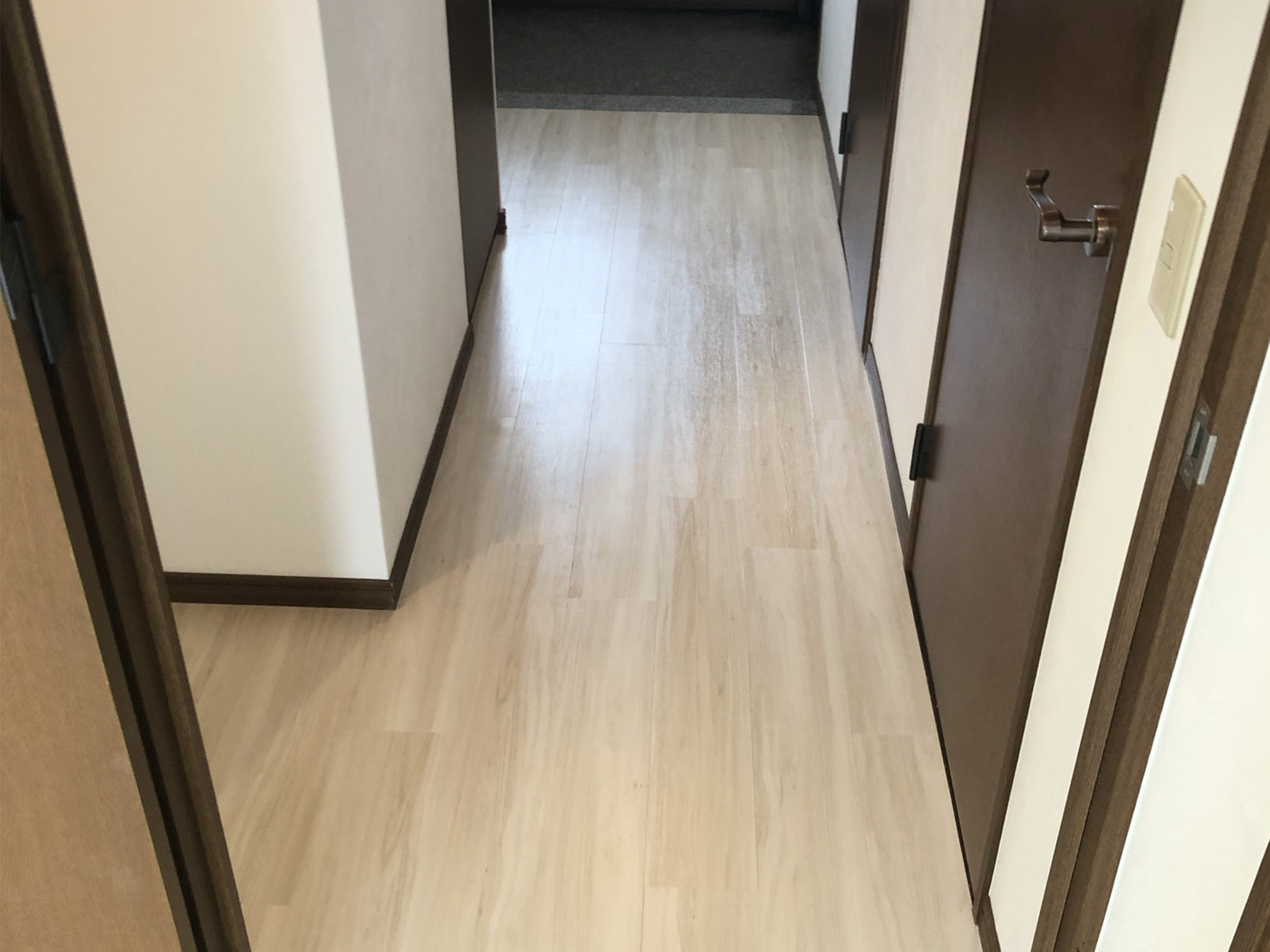 施工後の廊下です。以前の暗い色から白く明るい床に張り替えました。