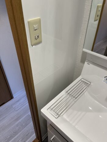 洗面化粧台にはキッチンパネルを貼ることで、水にぬれても汚れにくく日々のお手入れを楽にすることができます。