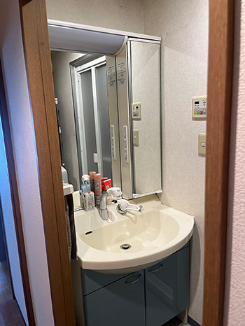 施工前の洗面化粧台のお写真です。洗面化粧台の壁にはキッチンぺネルを貼っていきます。